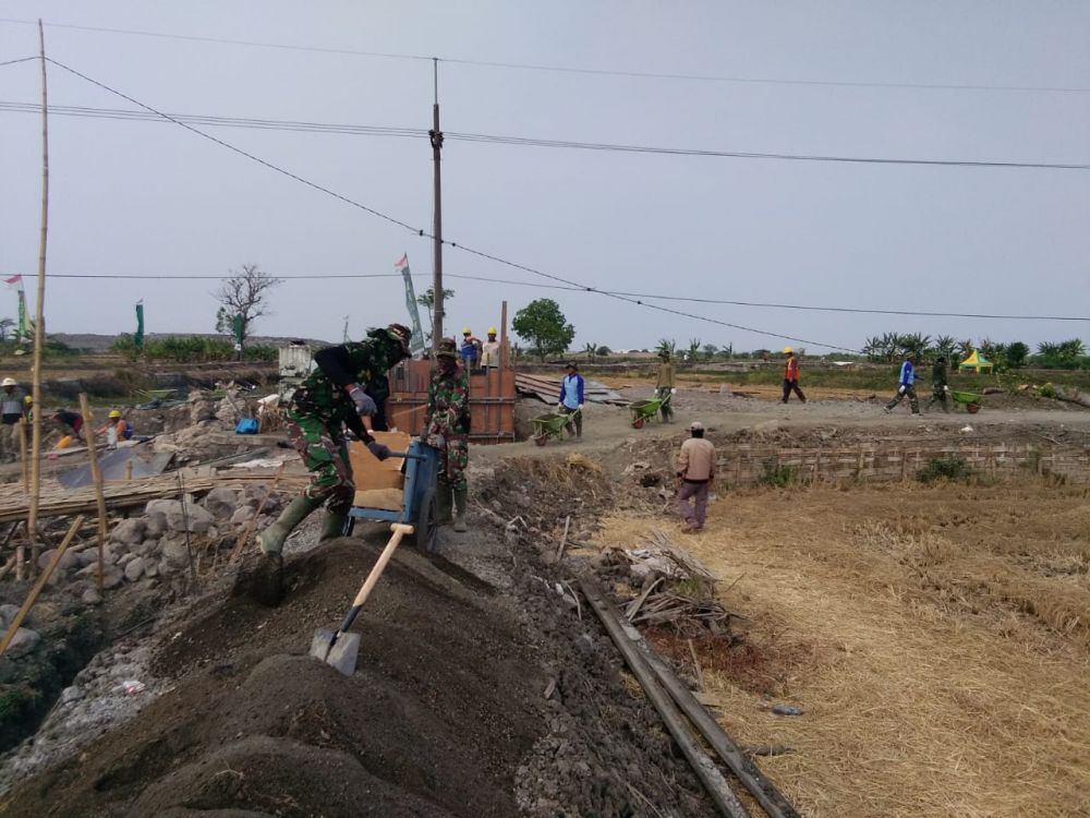 Sidoarjo - Satgas TMMD Ke-106 Kodim 0816 Kabupaten Sidoarjo beserta warga Desa Kupang terus menggenjot pengerjaan pembangunan saluran irigasi penahan jalan. Personel 0816 bersama warga bergotong-royong menyelesaikan salah satu sasaran fisik dalam TNI Manunggal Membangun Desa (TMMD) di Desa kupang Kecamatan jabon.