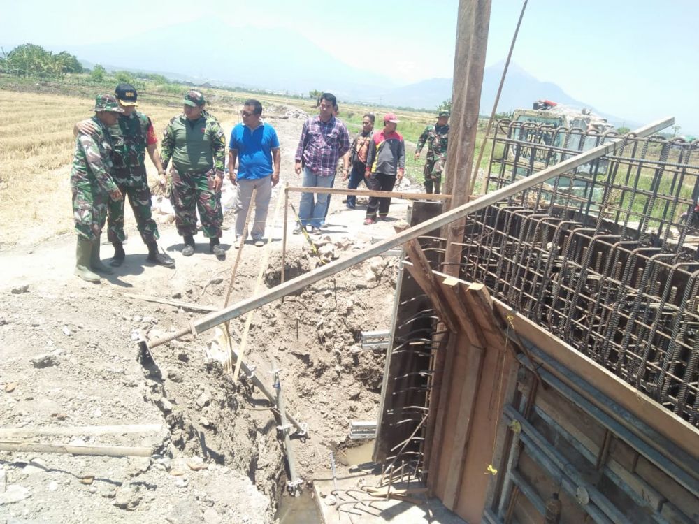 Sidoarjo - Pengerjaan sasaran Jembatan Beton oleh Satgas TMMD ke - 106 Kodim 0816 Sidoarjo di Desa Kupang yang menghubungkan dengan Desa Semambung sudah sampai pada proses pemasangan batu dan pengecoran beton, Jumat (18/10/2019).