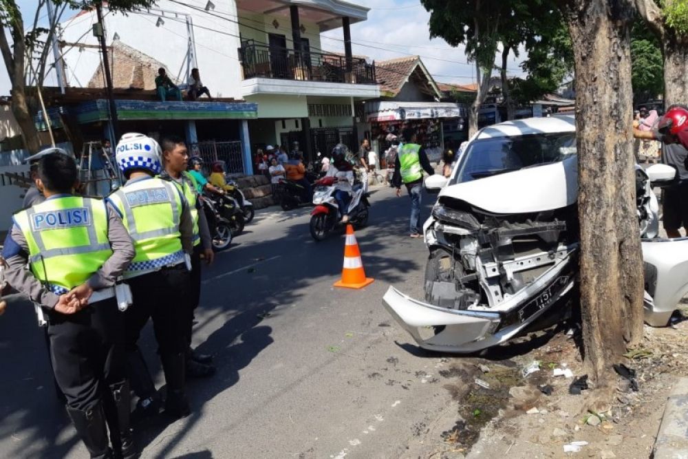 Mobil Minibus P 1151 W yang dikemudikan Holisin (30), warga Desa Kampunganyar, Kecamatan Glagah tersebut, menabrak sepeda motor yang parkir dipinggir jalan dan Baru berhenti setelah kemudian menabrak pohon.