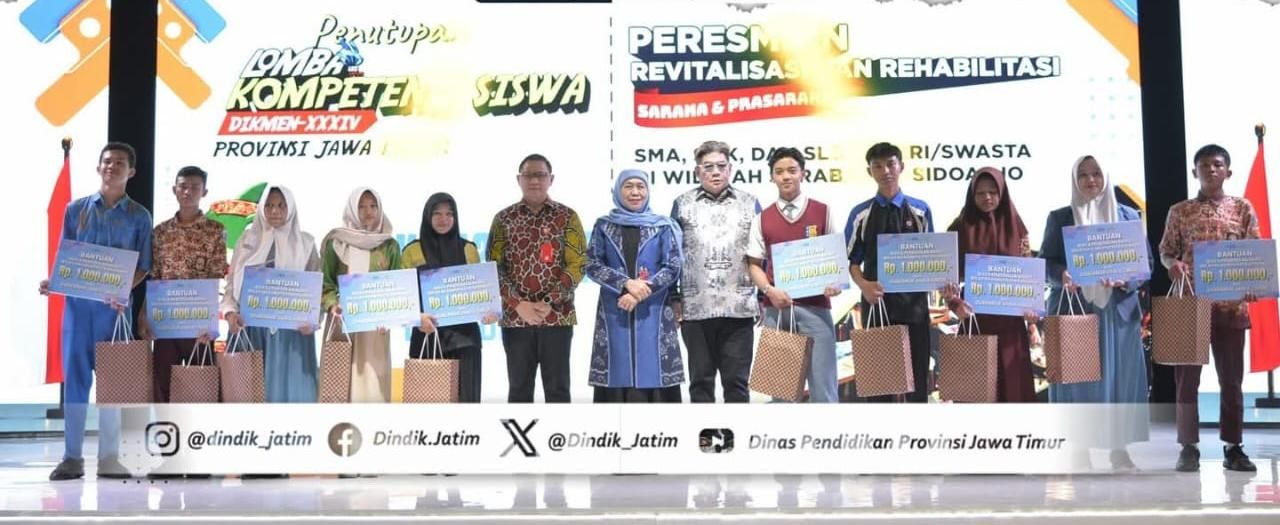 abadinews.id, Surabaya – Komitmen Pemerintah Provinsi Jawa Timur dalam memperkuat sektor pendidikan kembali diwujudkan melalui aksi nyata. Dalam rangkaian peresmian revitalisasi sejumlah sekolah di wilayah Surabaya dan Sidoarjo, sekaligus penutupan Lomba Kompetensi Siswa (LKS) Pendidikan Menengah (Dikmen) Jawa Timur Tahun 2026, Gubernur Jawa Timur, Khofifah Indar Parawansa, menyerahkan bantuan biaya pendidikan kepada insan pendidikan prasejahtera berprestasi, Kamis (9/4/2026).