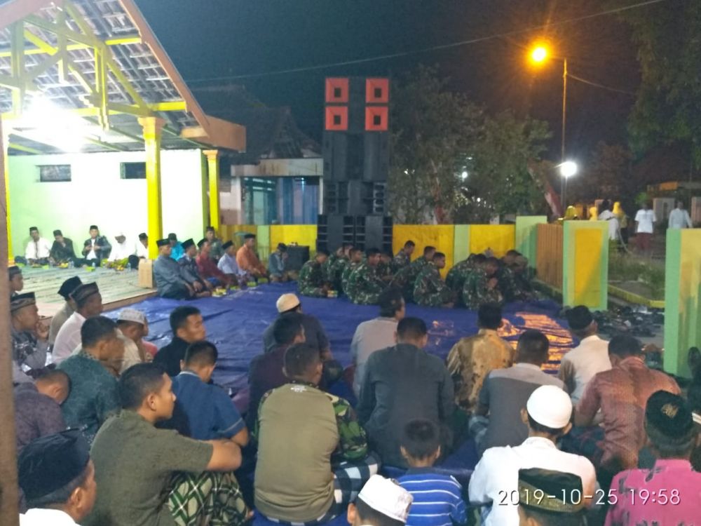 Sidoarjo - Babinsa Desa Kupang Sekaligus Bawas TMMD ke 106 Sertu Sugianto dan personil satgas TMMD ke 106 Ta 2019 Kodim 0816/Sidoarjo, menghadiri Pengajian Umum dalam rangka bersih Desa Kupang yang bertempat di balai desa Kupang, kecamatan Jabon, Kabupaten Sidoarjo. Jumat 25/10/2019.