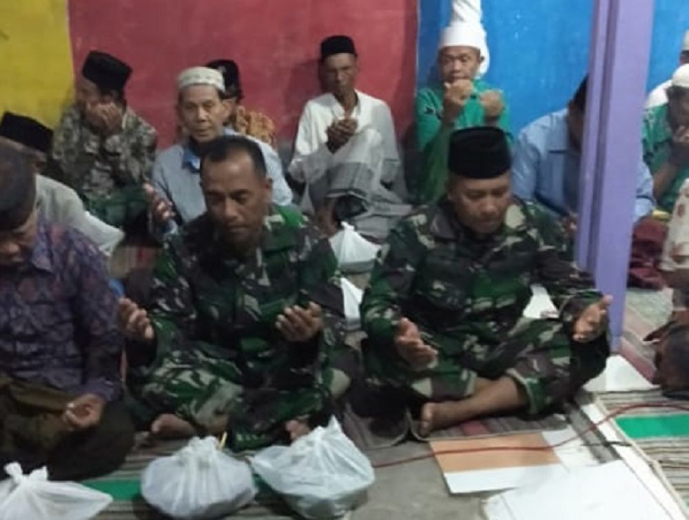 Satgas Bintal TMMD Letda Caj.Endri Susilo dan Serka M.Adam beserta anggota mengikuti kegiatan tahlil di rumah Almarhum Bpk.poniman (67) warga Desa kupang Kecamatan jabon Kabupaten sidoarjo, Kamis (03/10/2019) malam.