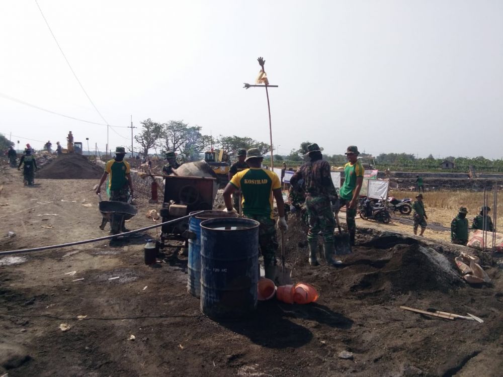 Sidoarjo - Ratusan Prajurit serbu lokasi TMMD Ke - 106 Kodim 0816 Sidoarjo, dalam sehari besi dan batu di angkat rame-rame guna pengecoran jembatan dan jalan Desa Kupang Kecamatan Jabon Kabupaten Sidoarjo.