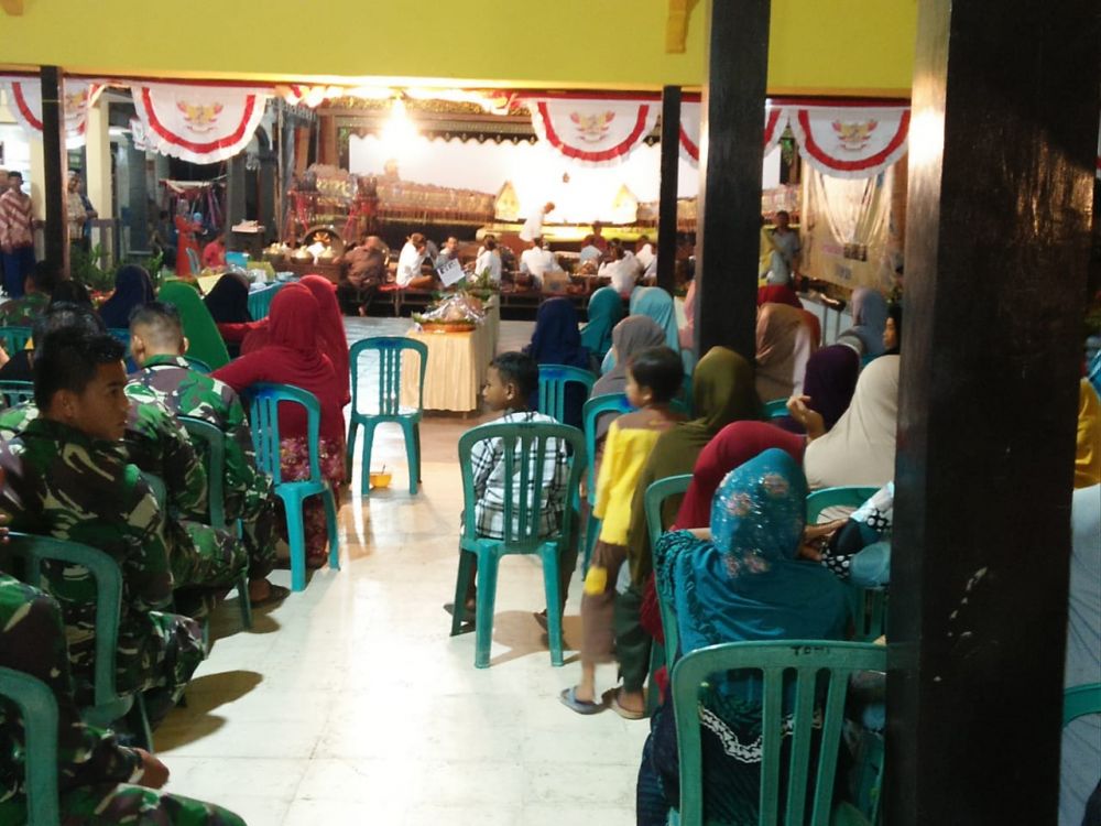 Sidoarjo - Babinsa Desa Kupang Sekaligus Bawas TMMD ke 106 Sertu Sugianto dan personil satgas TMMD ke 106 Tahun 2019 Kodim 0816/Sidoarjo,menghadiri pagelaran kesenian daerah yaitu Wayang Kulit dalam rangka bersih Desa Kupang yang bertempat di balai desa Kupang, kecamatan Jabon, Kabupaten Sidoarjo.